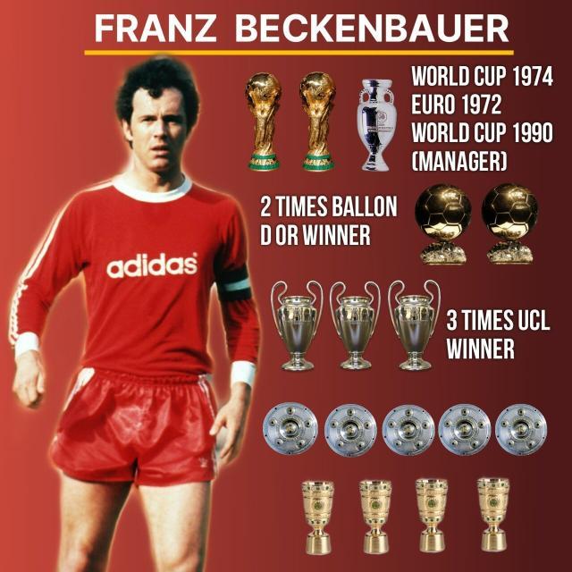球员时代,贝肯鲍尔作为国家队和俱乐部的领袖人物,在西德队夺得了1972欧洲杯和1974世界杯冠军,在拜仁则实现了欧冠三连庄。从教后,他又率领西德队问鼎1990世界杯。